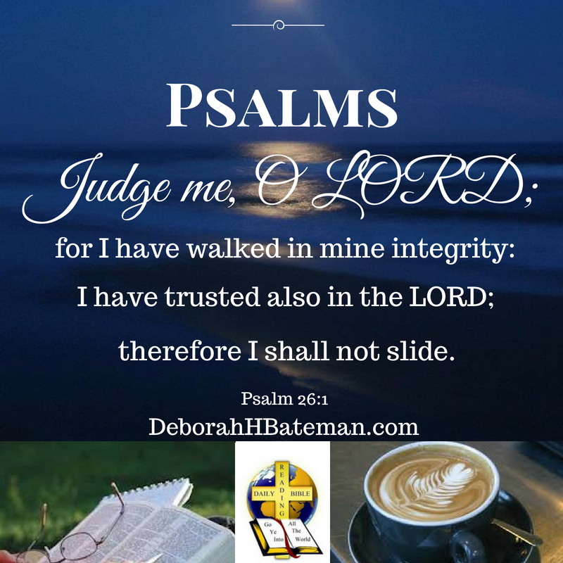 Today’s Daily Bible Reading is from Psalm 26:1-12. Psalm 26 is a Psalm of David. David asks God to judge him. He said he walked in integrity and trusted in the LORD. He tells God to examine him and test him. David keeps God’s loving kindness before his eyes and he walks in the truth of the LORD.