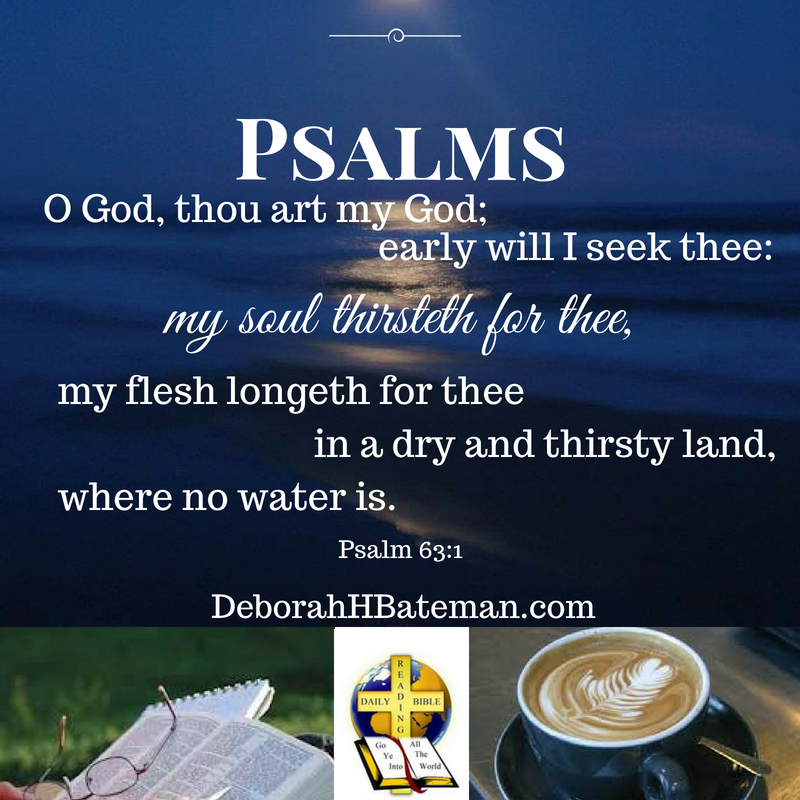 Today’s Daily Bible Reading is from Psalm 63:1-11. Psalm 63 is a Psalm of David. It was written when he was in the wilderness of Judah. David declares that he’ll seek God early in the morning because his soul thirsts for God. Have you ever been really thirsty on a hot, dry day? David had a deep longing in his soul to spend time with God. Do you thirst for Him?
